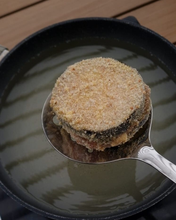 À ce stade, passez chaque aubergine farcie, d’abord dans les œufs battus, puis dans le mélange de chapelure et de farine de maïs (facultatif, la farine de maïs toastée).