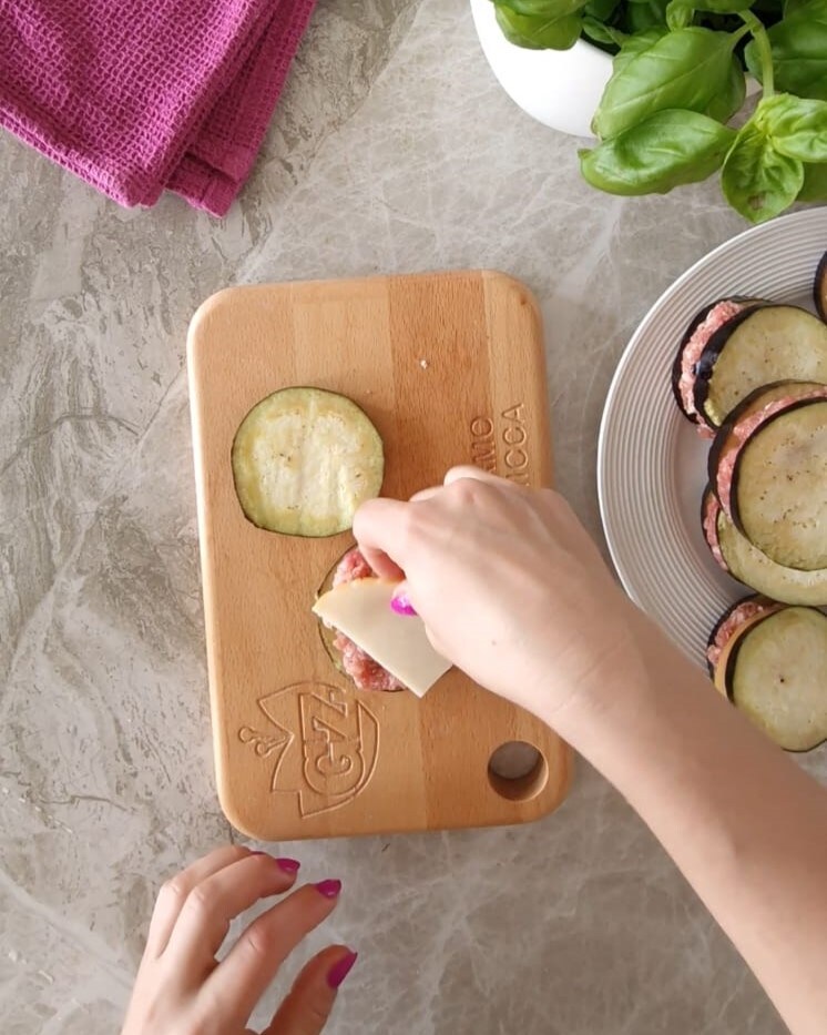 Fermez en superposant avec une autre tranche d’aubergine pour réaliser un médaillon farci.