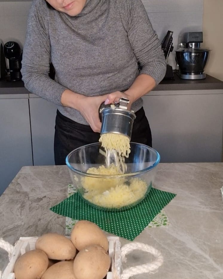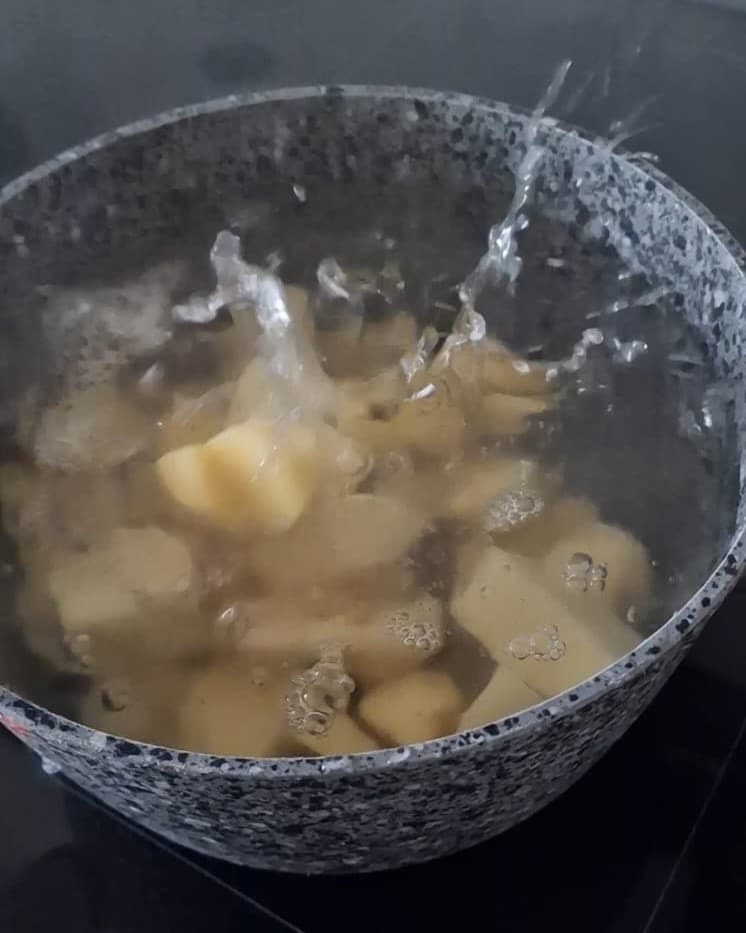 Épluchez les pommes de terre et coupez-les en morceaux, puis faites-les cuire dans de l’eau bouillante salée pendant environ 7-8 minutes. Une fois cuites, écrasez-les dans un bol.