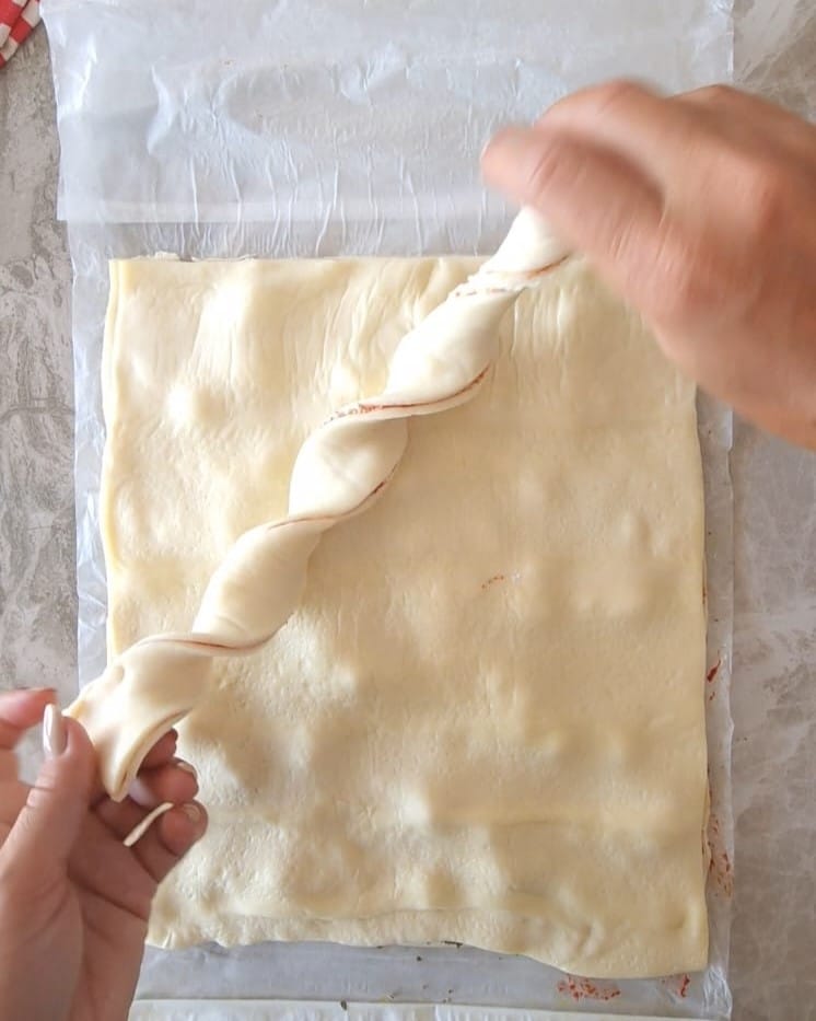 Procédez à la découpe des bandes, larges d’environ 3 cm, en vous aidant d’un couteau à lame lisse. Ensuite, torsadez chaque bande sur elle-même pour réaliser une spirale.