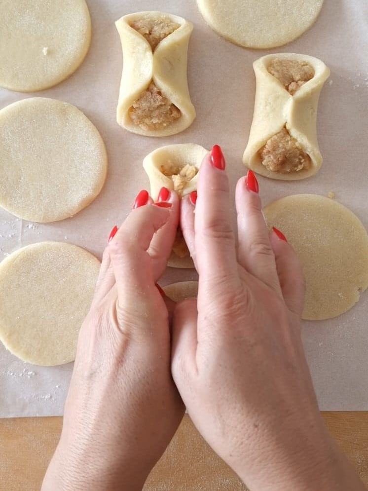 Garnissez avec le mélange, puis joignez les deux extrémités et transférez-les sur une plaque recouverte de papier cuisson.