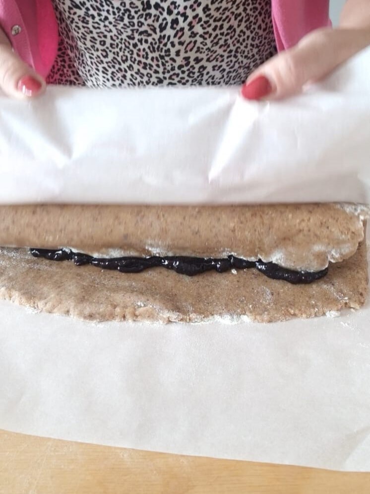 Après le temps de repos, divisez la pâte en deux parts égales et, à l’aide de papier sulfurisé, étalez deux rectangles d’environ 1 cm d’épaisseur, puis étalez-y la confiture.