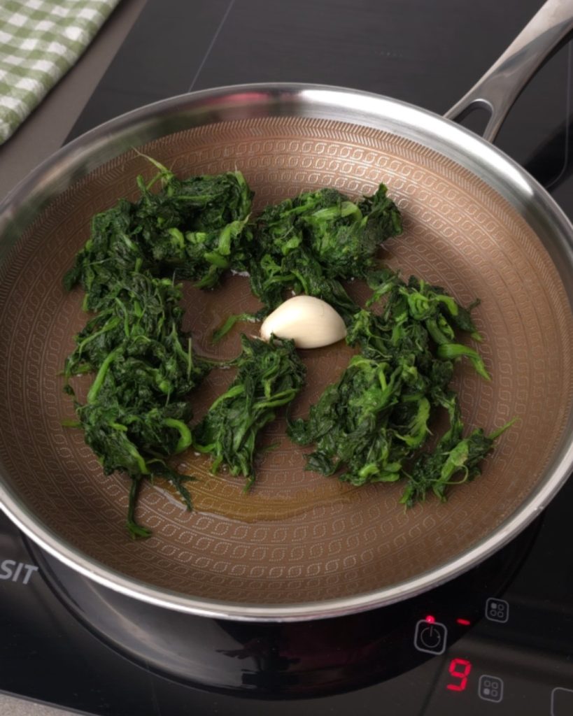 Faites cuire les épinards dans une poêle avec une gousse d’ail, un filet d’huile d’olive et une pincée de sel. À la fin, hachez les épinards dans un bol à l’aide de ciseaux, puis ajoutez la saucisse émiettée.