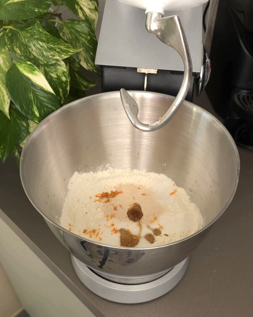 Dans le bol du robot, versez la farine, la levure et le sucre. Ajoutez les zestes râpés et la vanille. Dans un pichet, mélangez le lait et les œufs et commencez à les verser dans le bol du pétrin, en pétrissant ensuite avec le crochet.