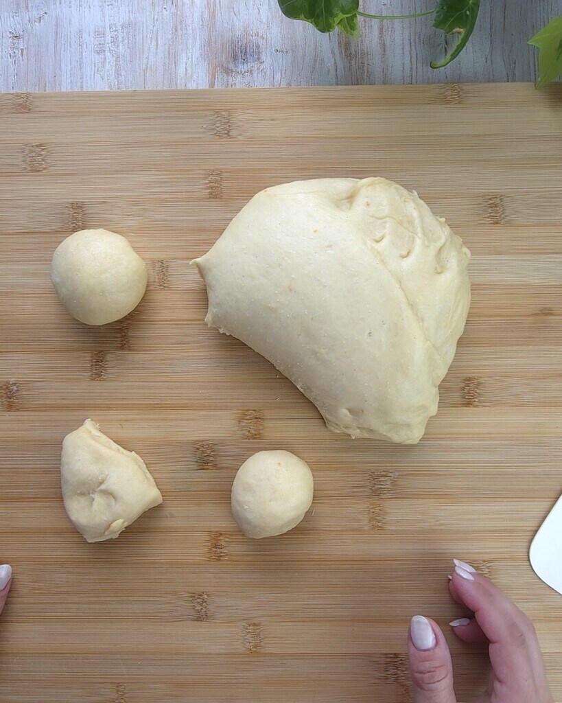Après le temps de repos, divisez la pâte en 8 morceaux d’environ 12 g chacun. Transférez-les sur une plaque recouverte de papier sulfurisé et mettez au four éteint et laissez lever à nouveau, jusqu’à ce qu’ils soient bien gonflés.