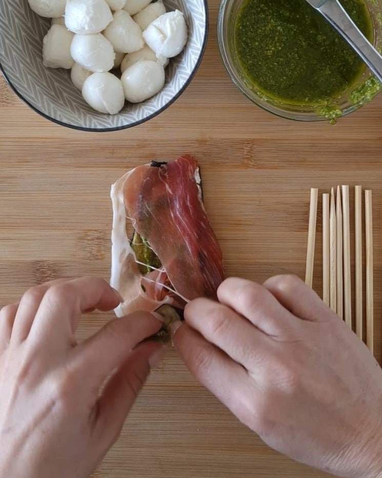Les brochettes peuvent être conservées au réfrigérateur jusqu’au lendemain. Si vous n’aimez pas le pesto de basilic, vous pouvez le remplacer par du pesto de pistache, ou le remplacer par un fromage crémeux comme le Philadelphia ou le stracchino.