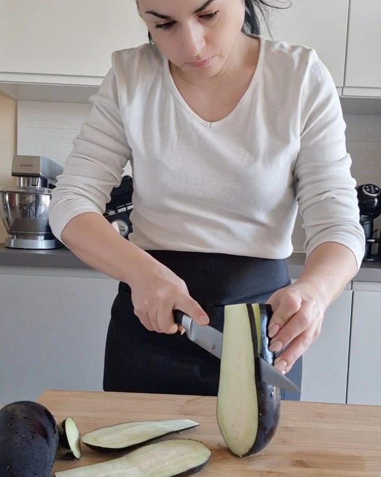 Ensuite, enfournez les aubergines et faites-les cuire au four à 200°C pendant environ 10 minutes, ou jusqu’à ce qu’elles soient dorées.