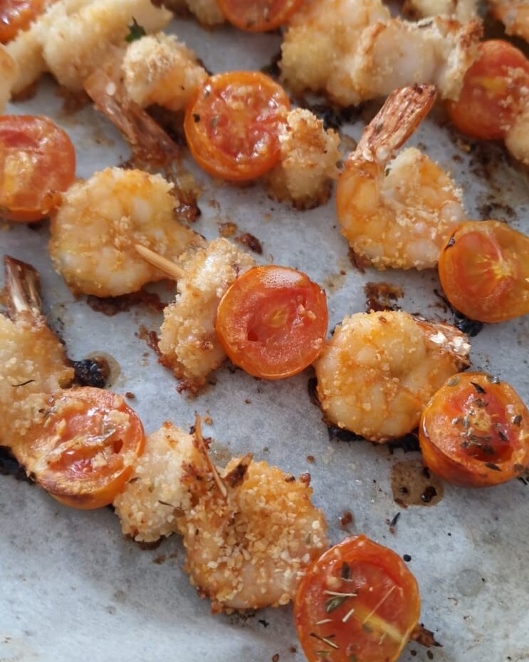 Les brochettes de crevettes et calamars cuites au four sont un vrai délice, un plat principal idéal pour toute la famille. Recette simple et légère, pour les faire, j’ai utilisé des calamars et des crevettes, intercalés avec des tomates cerises. Une délicieuse panure de chapelure, persil et ail recouvre les brochettes.