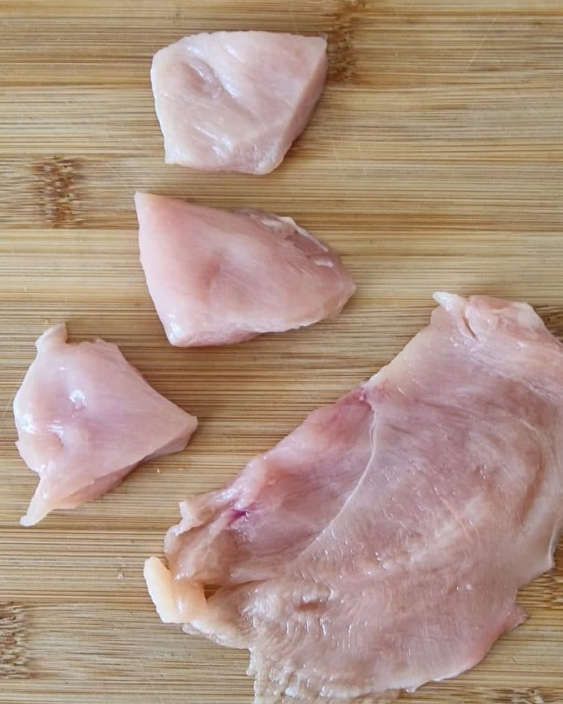 Coupez la poitrine de poulet en dés, puis marinez-la avec du yaourt, du sel et du paprika, puis laissez-la reposer 1 heure.