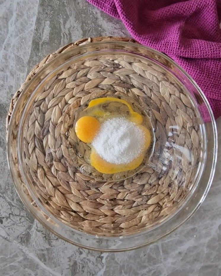 • Cassez les œufs dans un grand bol avec le sucre, battez-les avec une fourchette, puis ajoutez l’huile et la grappa.