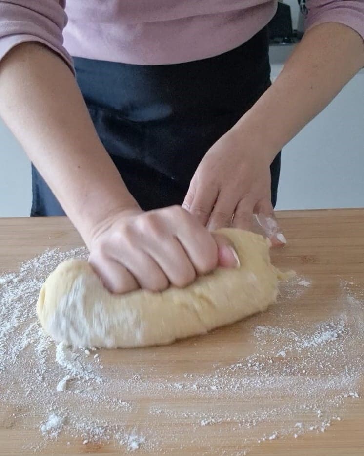 • Mélangez bien avec la fourchette, amalgamez bien le tout, puis transférez le mélange sur le plan de travail et travaillez jusqu’à obtenir une pâte lisse et douce.