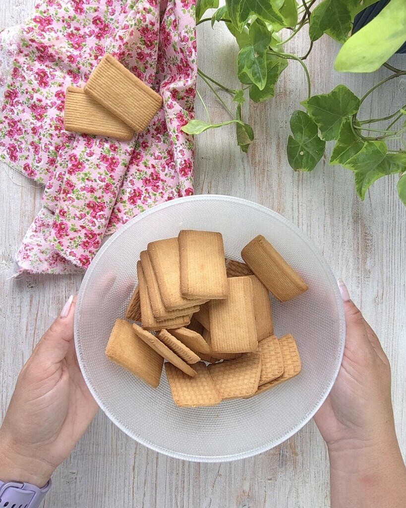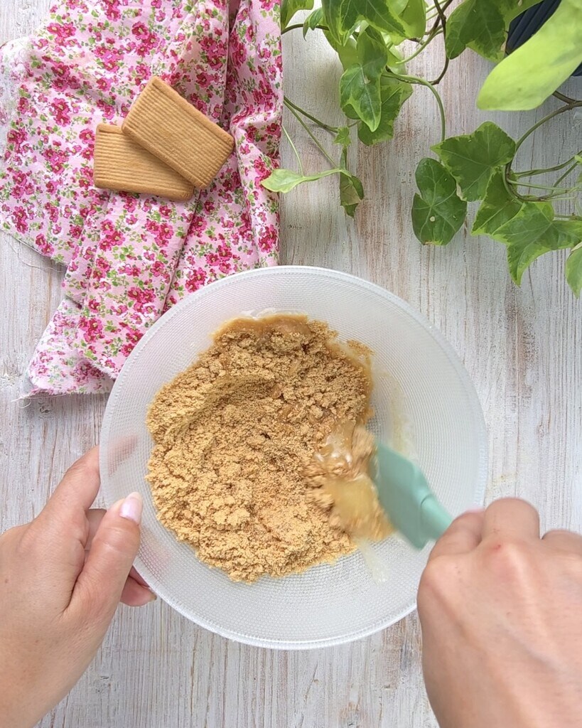 • Émiettez les biscuits avec un mixeur, puis ajoutez le beurre fondu et mélangez bien le tout.