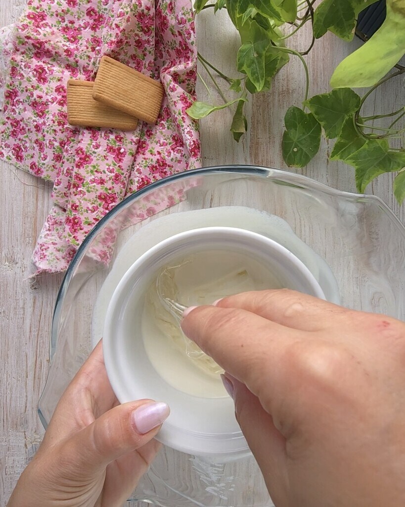 • Mettez à tremper les feuilles de gélatine dans de l’eau froide et laissez-les ramollir quelques minutes, après quoi essorez-les de l’eau en excès et faites-les fondre avec quelques cuillères de lait.