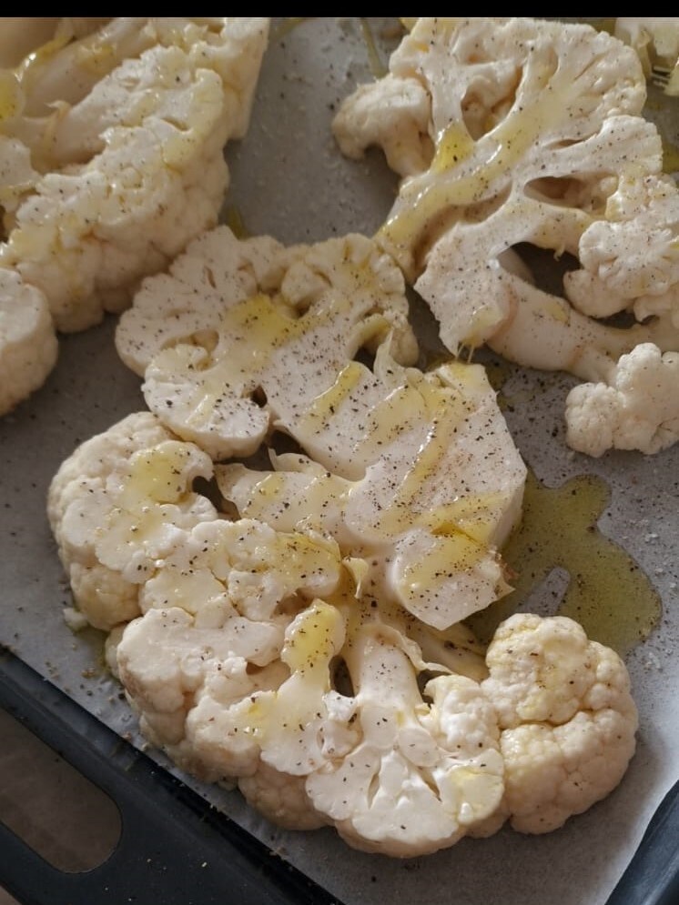 Commencez par laver le chou-fleur, puis coupez-le en tranches. Transférez les tranches dans un plat tapissé de papier sulfurisé.