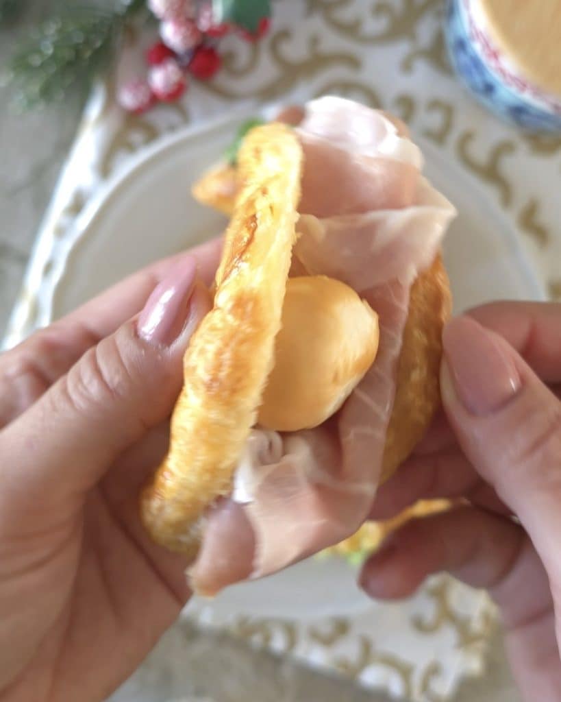 Quand les coquilles seront tièdes, coupez-les comme des petits pains et farcissez-les avec du jambon cru et de la scamorza. Dans ma version, j’ai utilisé des charcuteries et des fromages, mais vous pouvez créer de nombreuses autres combinaisons.
