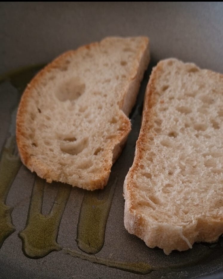 Coupez le pain en tranches, huilez une poêle avec un filet d’huile et toastez le pain des deux côtés.