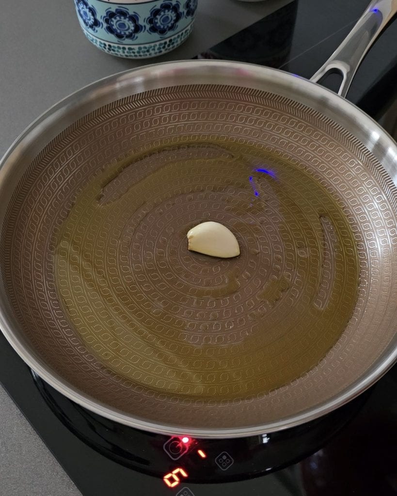 Faire revenir l’ail dans une poêle avec un filet d’huile.