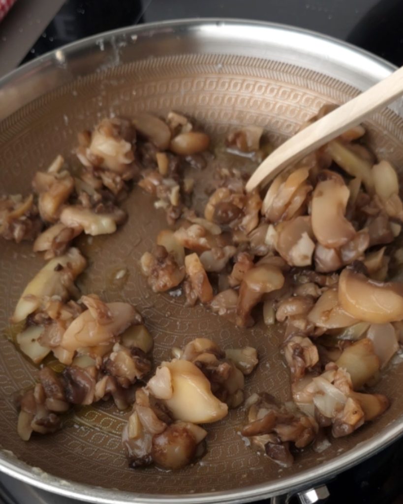 Dans la même poêle, ajoutez l’huile et les champignons, salez et faites cuire 6-7 minutes.