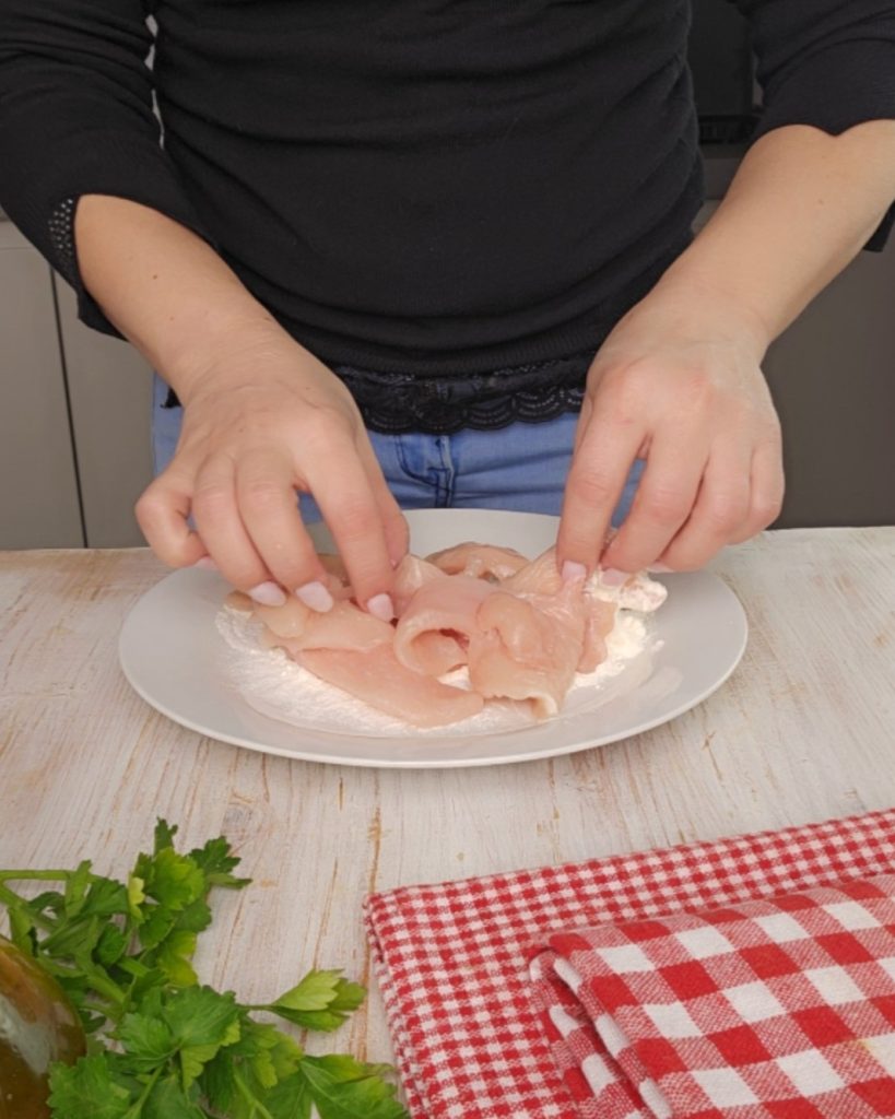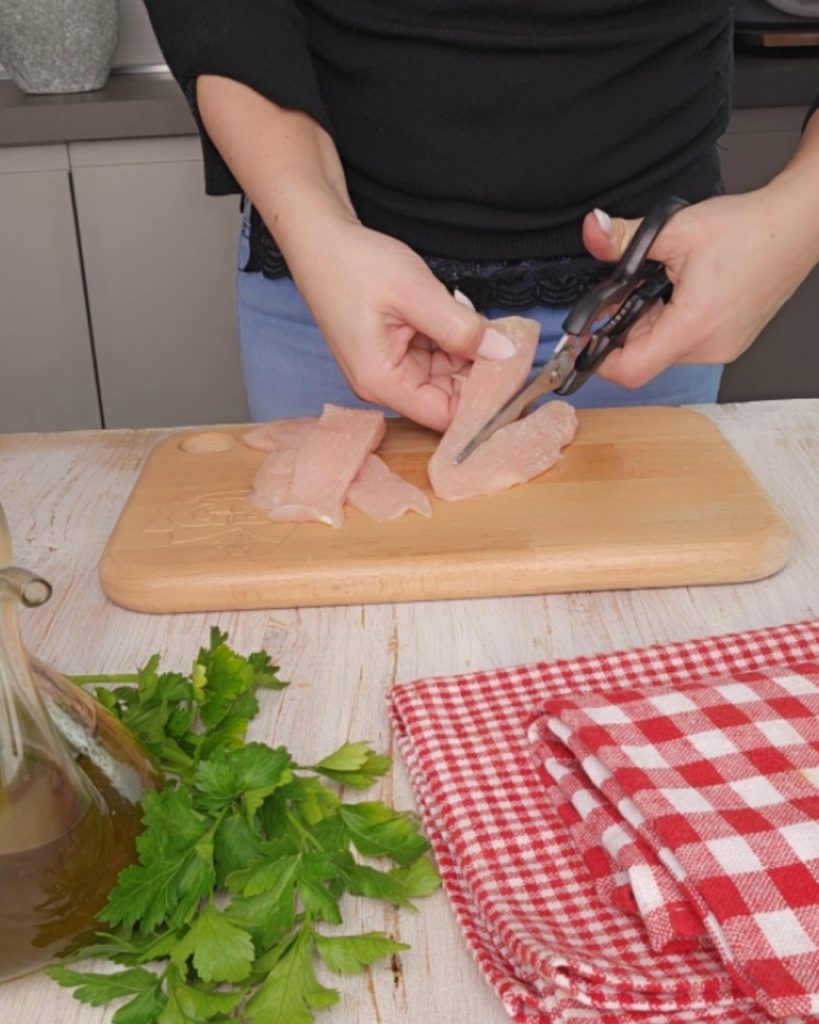 Coupez le poulet en fines lanières (straccetti) avec un couteau à lame lisse ou, à défaut, des ciseaux.