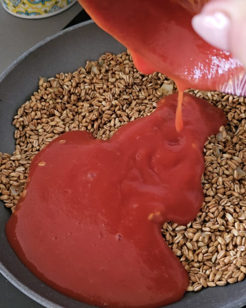 Ajoutez l’épeautre et faites-le griller quelques minutes, puis ajoutez la purée de tomates et une louche de bouillon chaud.