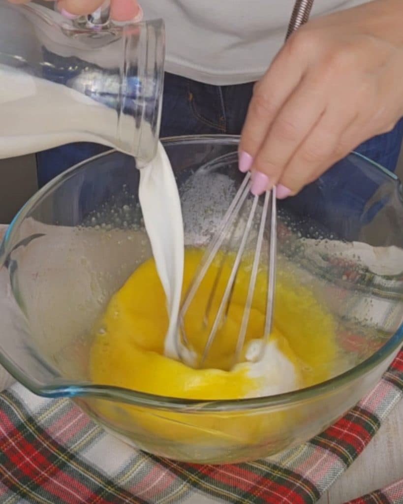 • Dans un grand bol, battez les œufs avec le sucre, l’arôme de vanille, puis versez le lait et ensuite l’huile en filet, puis incorporez la farine et la levure tamisées et mélangez bien.