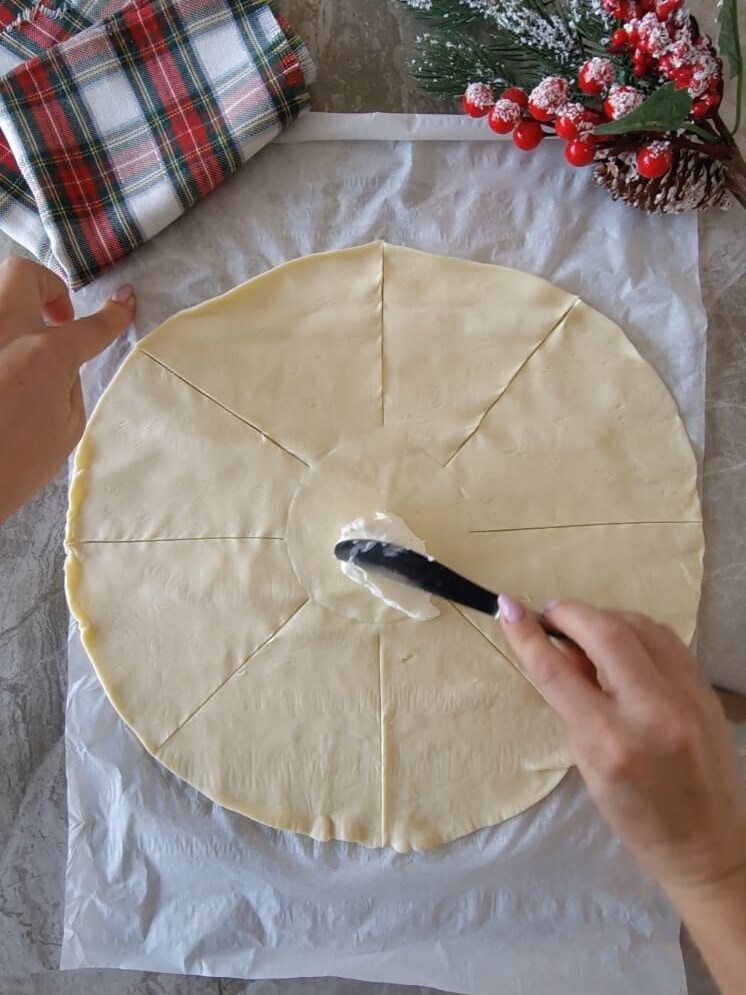 Déroulez la pâte feuilletée, placez une tasse au centre et faites des incisions, divisez en 8 parties, puis garnissez avec le Philadelphia et le saumon.