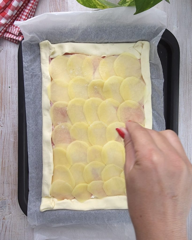 Lavez ensuite et coupez très finement les pommes de terre, puis déposez-les sur la pâte feuilletée garnie.