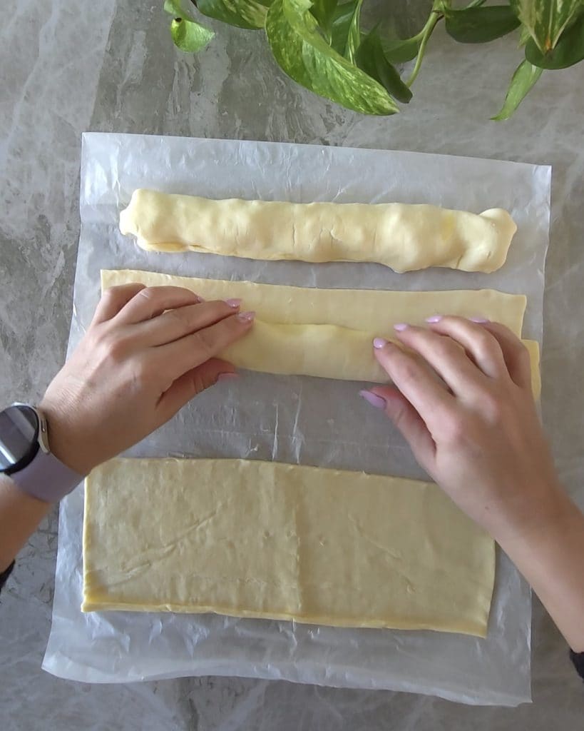 Déroulez la pâte feuilletée et divisez-la en au moins trois parties, puis garnissez la pâte comme si vous deviez former des boudins.