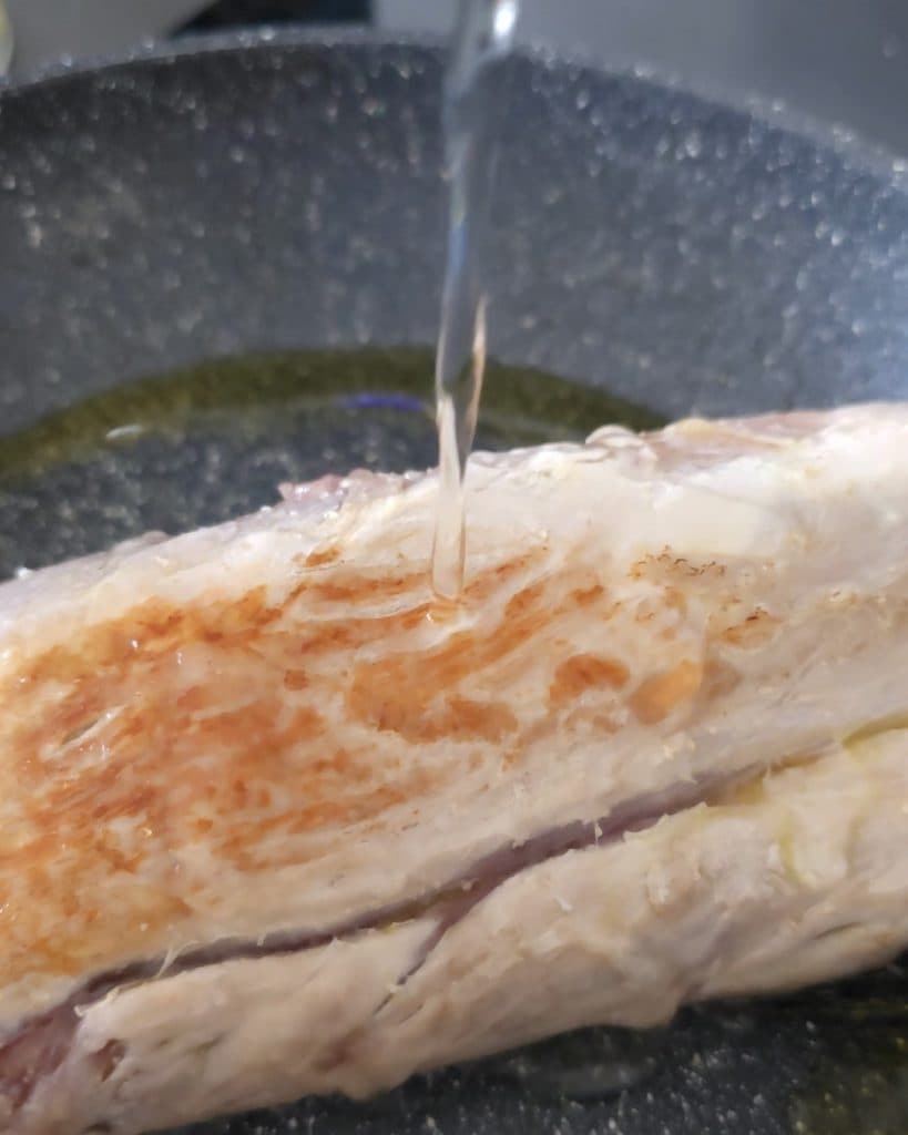 Faites cuire le filet des deux côtés. Assurez-vous de ne pas piquer la surface pour éviter la perte de liquides. Salez puis déglacez avec le vin et laissez évaporer complètement. À ce stade, déposez la viande dans une assiette et laissez-la refroidir.
