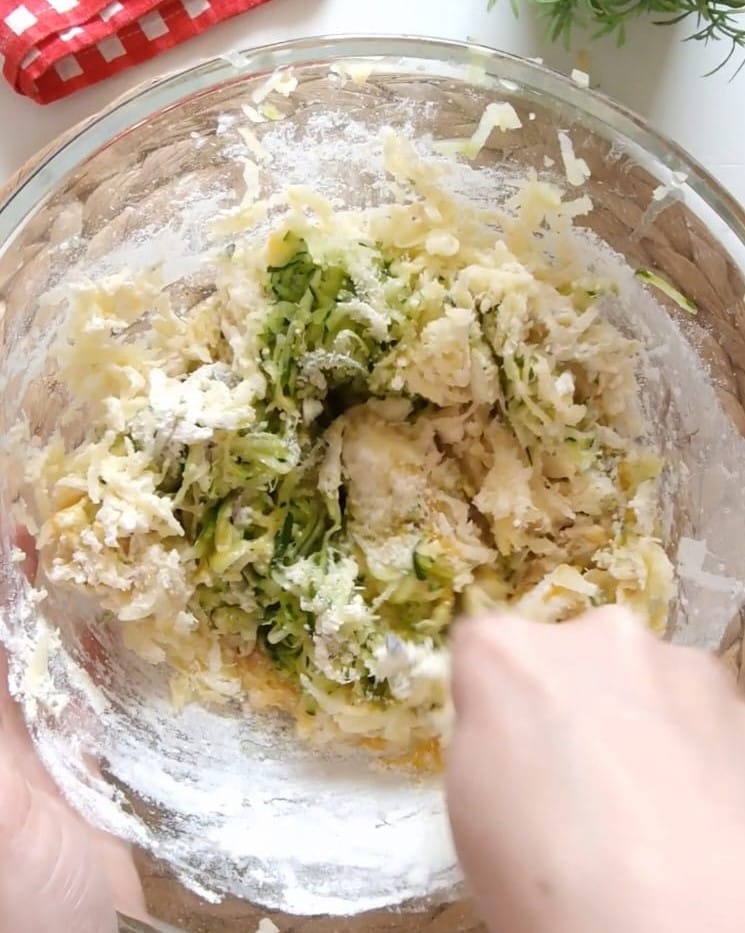 Épluchez également les pommes de terre et râpez-les, puis réunissez les légumes bien égouttés dans un bol.