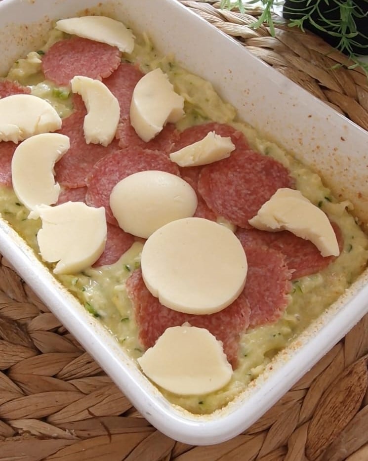 Mélangez le tout, puis versez la moitié de la préparation dans un plat huilé et saupoudré de chapelure, garnissez de saucisson et de fromage.