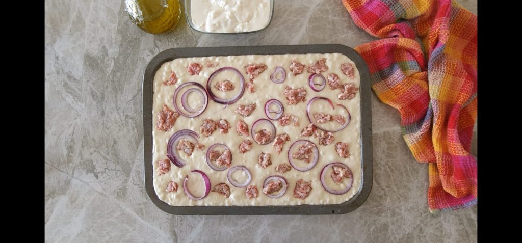 La focaccia avec stracchino et saucisse est une recette très simple, elle n’a pas besoin de pâte ni de longues levées, dans ma version je l’ai garnie de stracchino, saucisse et oignon. Elle est vraiment délicieuse! En famille, nous l’avons littéralement dévorée. Pâte moelleuse, rapide et savoureuse, essayez-la, je suis sûre que vous l’aimerez.