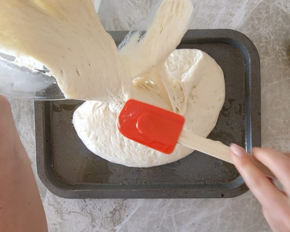 Après le temps de repos, renversez la pâte dans une plaque de 20×30 cm bien huilée au préalable.