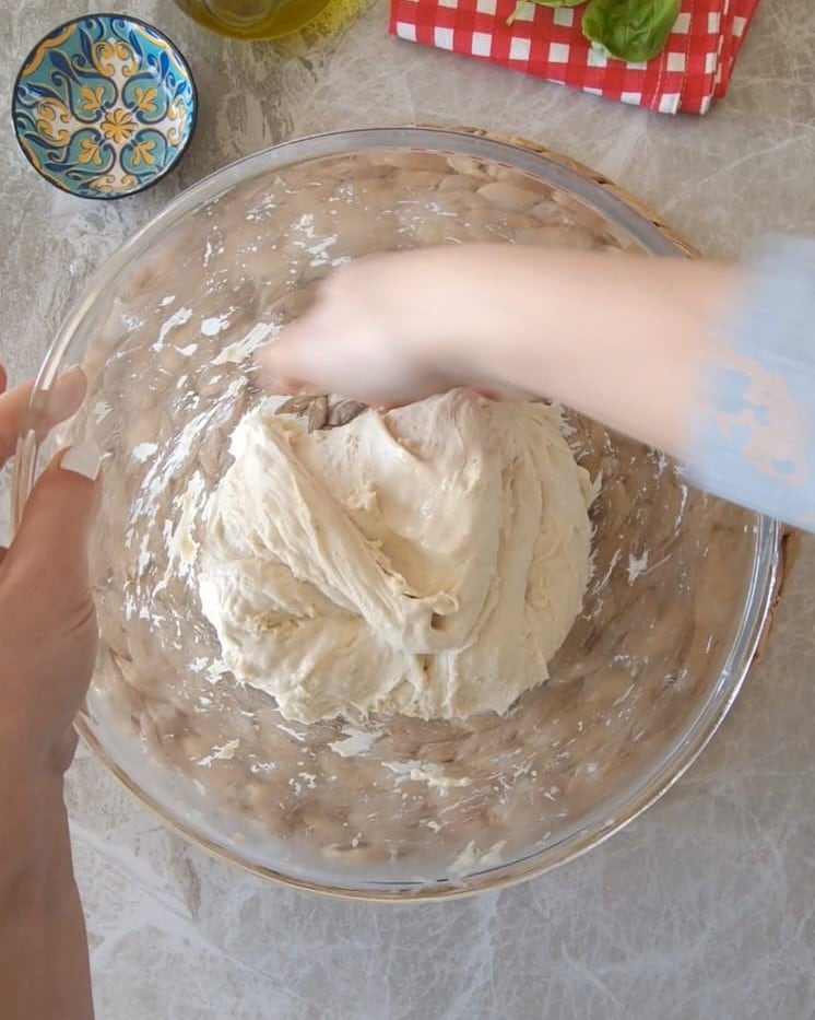 Après le temps de repos, faites des plis, toujours dans le bol, en tirant les bords vers le centre.