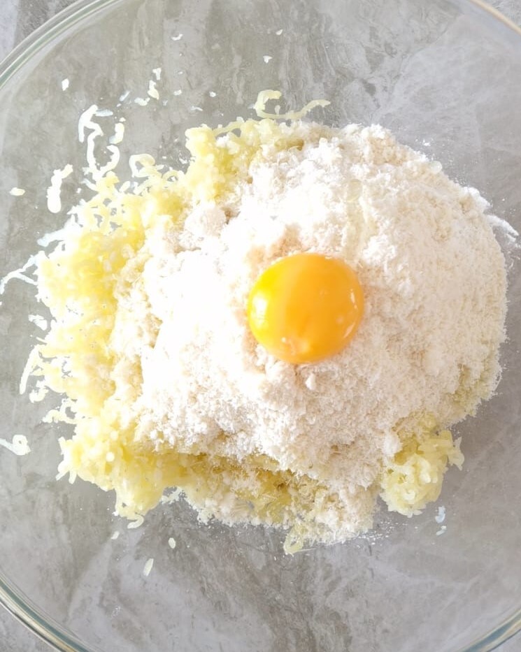 Assaisonnez avec du sel et du poivre, puis ajoutez le parmesan râpé et l’œuf, puis mélangez bien. Enfin, incorporez la farine et pétrissez bien jusqu’à obtenir une pâte homogène.