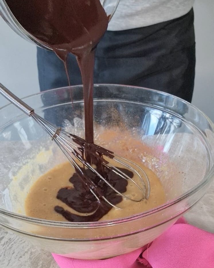 Entre-temps, battez les œufs avec le sucre et la cannelle, ajoutez la farine et mélangez bien. Ensuite, ajoutez le chocolat fondu et incorporez avec le fouet.