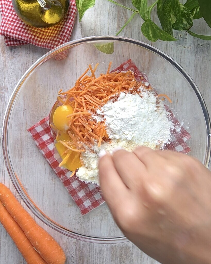 • Salez et poivrez, puis incorporez la farine et un filet d’huile, ensuite mélangez le tout. Disposez une partie des carottes et réalisez des disques circulaires qui ressemblent à des galettes.