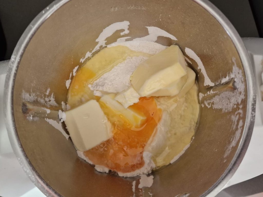 Dans un robot, mélangez la farine, le sucre, les œufs et le beurre. Commencez à pétrir, jusqu’à obtenir un mélange bien compact.