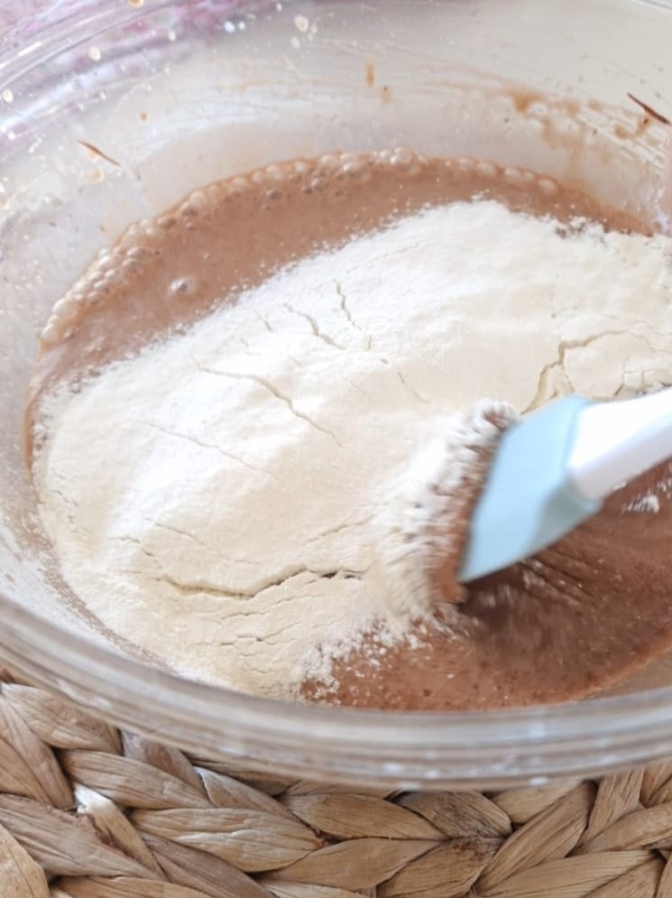 Enfin, incorporez les farines et la levure tamisées et mélangez bien.