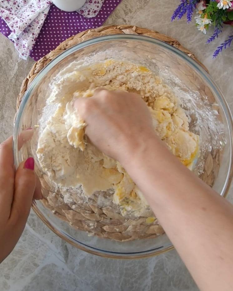 Dans un bol, mettez la farine, le beurre coupé en morceaux, la levure chimique, et travaillez rapidement avec la farine. Ajoutez le sucre, les œufs, la levure et mélangez le tout.
