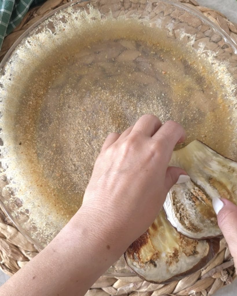 À ce point, nous assemblons le gâteau. Reprenez les aubergines et disposez-les en étoile dans un moule bien huilé et saupoudré de chapelure.