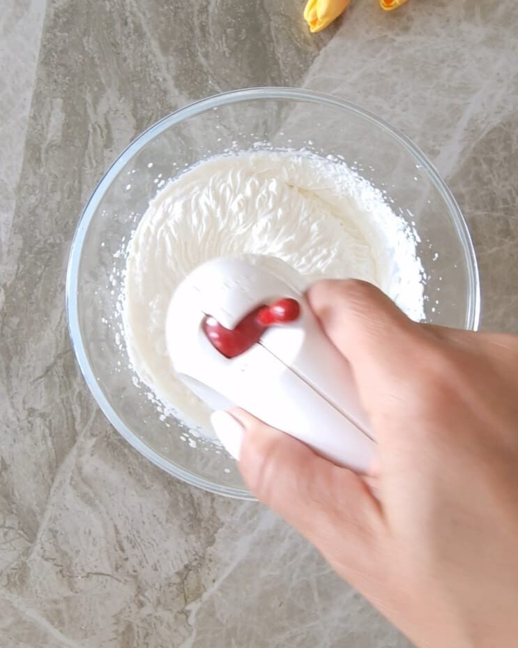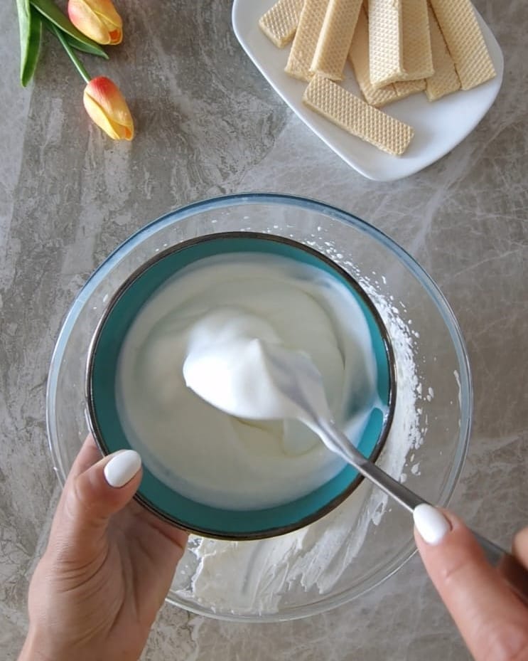 Ensuite, ajoutez le yaourt à la crème et mélangez sans démonter le mélange.