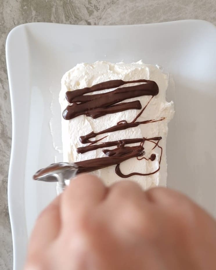 Terminez avec la crème et mettez au congélateur pendant au moins 5 heures. En attendant, préparez la sauce au chocolat, en mettant dans un verre une cuillère de crème de noisettes et 2 cuillères à soupe de lait, puis chauffez au micro-ondes ou au bain-marie et mélangez.