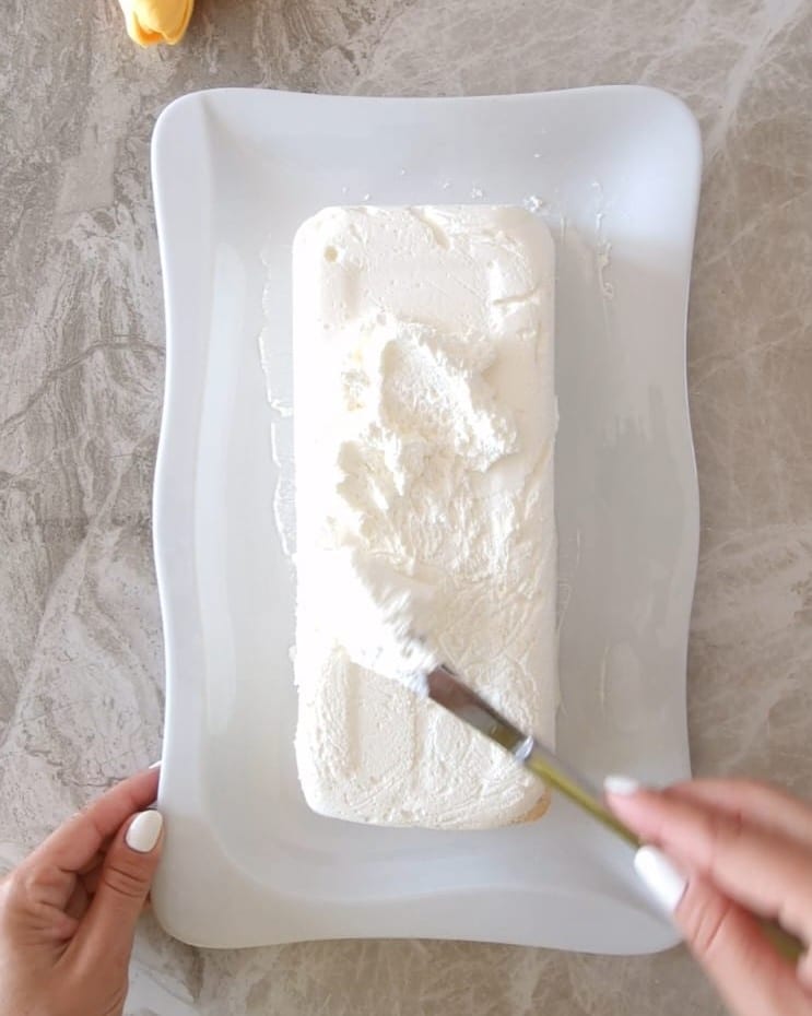 Démoulez ensuite votre gâteau de biscuits gaufrés et yaourt sur un plat de service et avec la crème restante, décorez la surface en lissant.