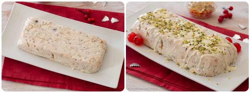 Après le temps de refroidissement, démoulez le gâteau sur un plat de service et garnissez avec du chocolat fondu, des éclats de pistaches et des cerises.