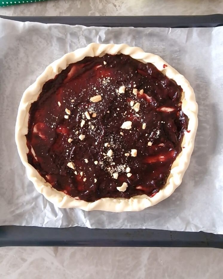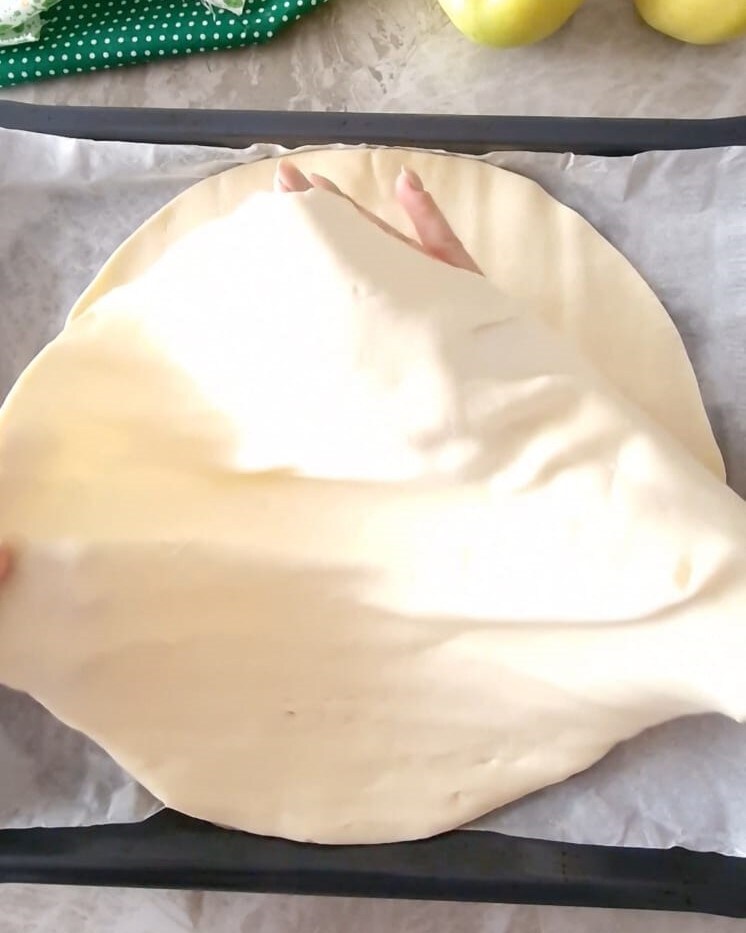 Déroulez la pâte feuilletée avec son papier, sur une plaque de cuisson et posez-en une autre dessus, roulez les bords pour former un bord, puis piquez-la avec les dents de la fourchette.