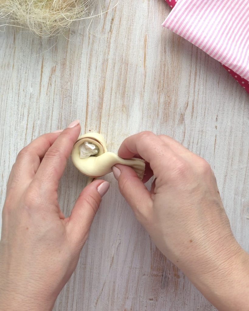 Prenez du papier sulfurisé et réalisez de petites boules grossières. Formez les lapins en entrelaçant les deux extrémités de la bande, en plaçant la boule de papier au centre.
