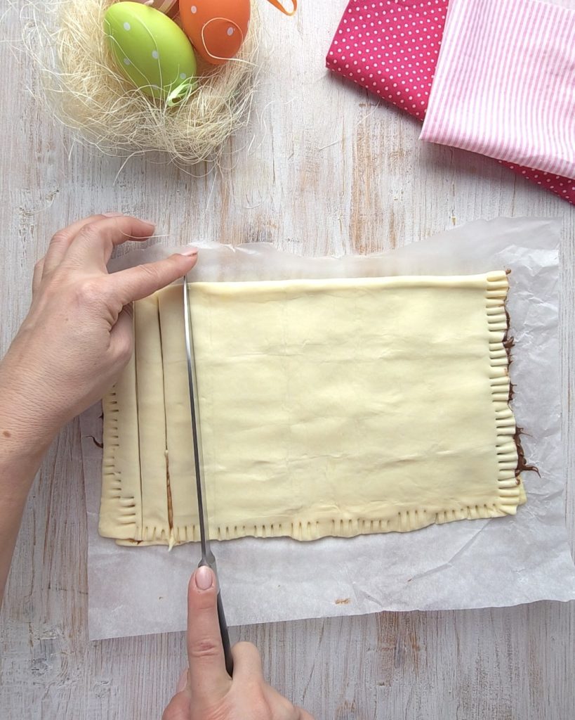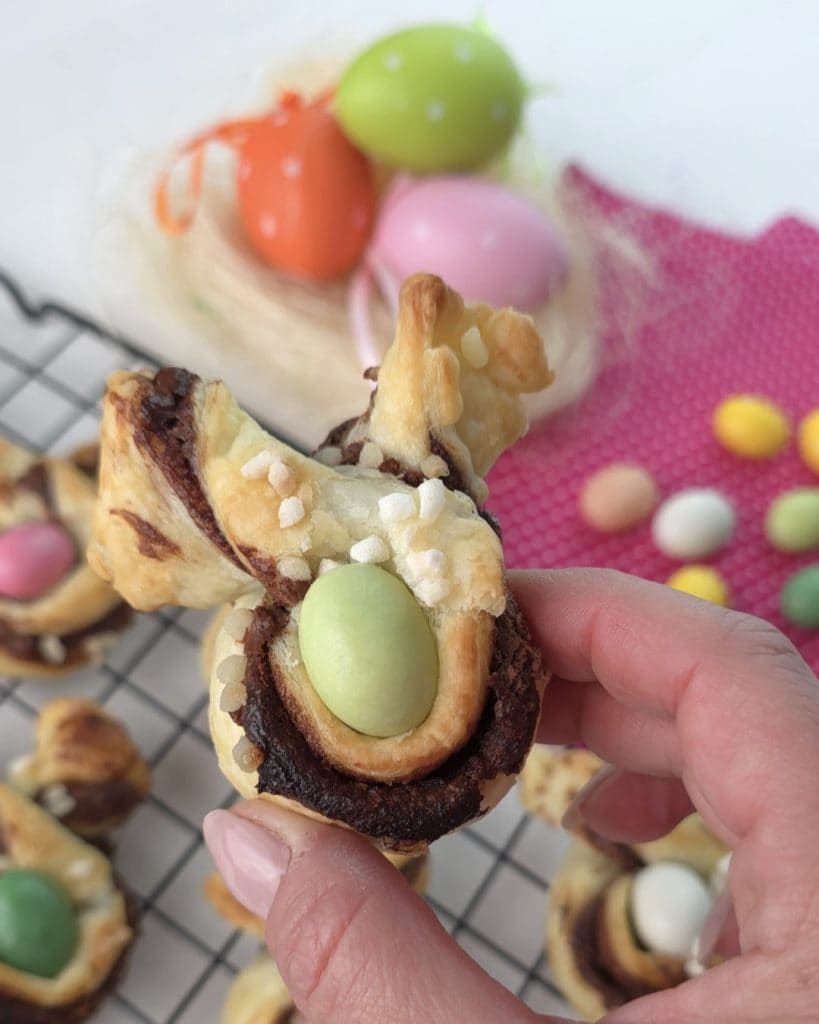 Lapins en pâte feuilletée, petits gâteaux gourmands faciles et irrésistibles. Si vous cherchez des recettes pour le menu de Pâques, jetez un œil à 30 recettes pour le Menu de Pâques et lisez aussi Entrées de Pâques. La recette que je vous propose aujourd’hui se réalise en 5 minutes, on garnit la pâte feuilletée déjà prête avec beaucoup de Nutella, mais si vous préférez, vous pouvez également utiliser de la crème de pistache ou, à la place, la version salée avec tomate et mozzarella où vous pouvez ajouter une olive au centre.