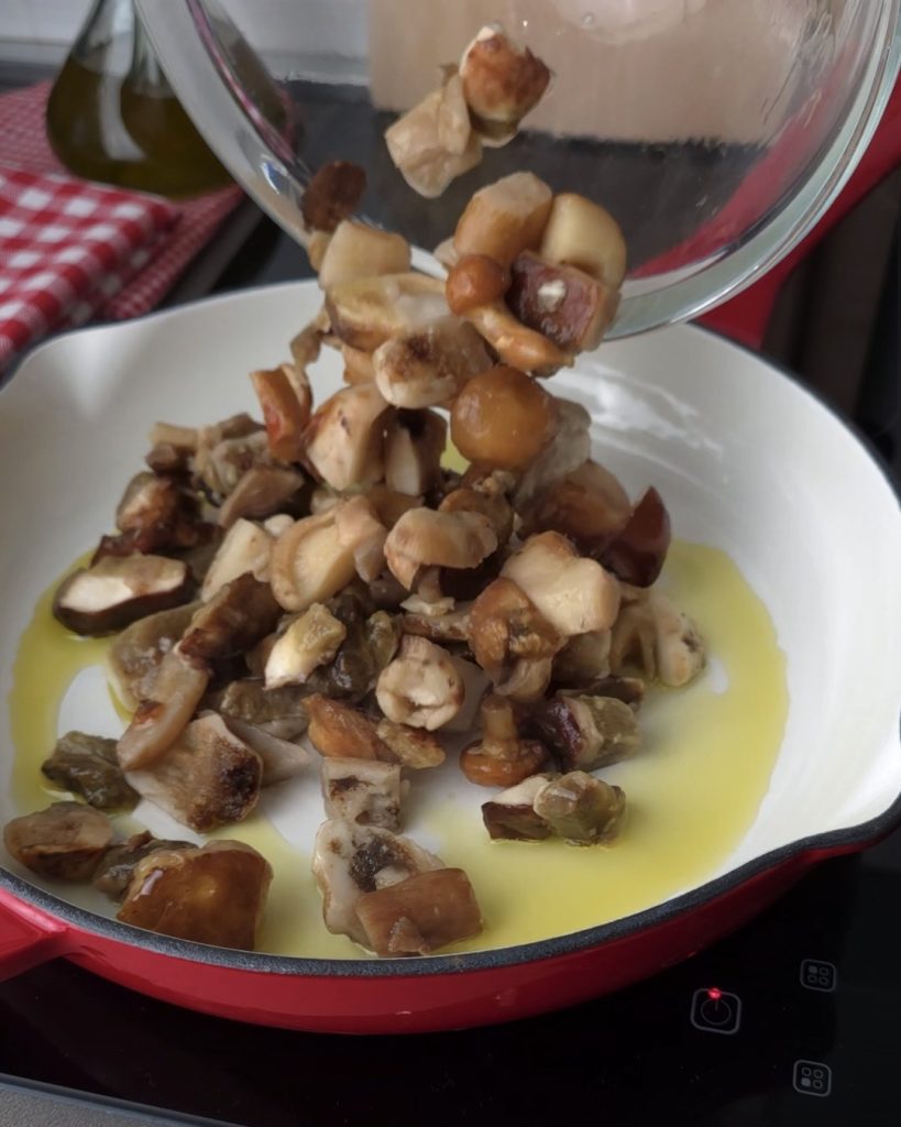 Nettoyez et coupez les champignons, si vous utilisez des surgelés, rincez-les brièvement à l’eau, faites-les revenir dans une poêle avec une gousse d’ail et un filet d’huile.