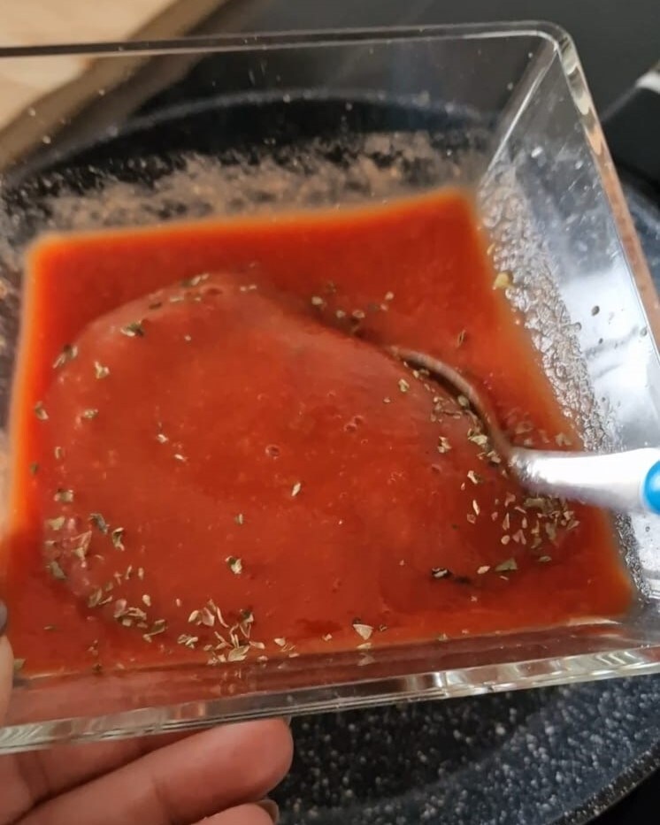 Pour commencer, assaisonnez le coulis de tomates avec de l’origan, du sel et un filet d’huile.